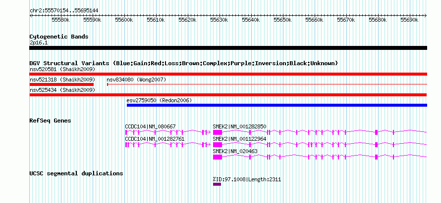 |  | Variant Type | CNV loss |  | Copy Number |  |  | Allele State |  |  | Allele Origin |  |  | Probe Count |  |  | Validation Flag |  |  | Merged Status | M |  | Merged Variants |  |  | Supporting Variants | nssv701562 |  | Samples |  |  | Known Genes | CCDC104, SMEK2 |  | Method | SNP array |  | Analysis | Sample-level CNVs |  | Platform | GPL6434 |  | Comments |  |  | Reference | Shaikh_et_al_2009 |  | Pubmed ID | 19592680 |  | Accession Number(s) | nsv525434