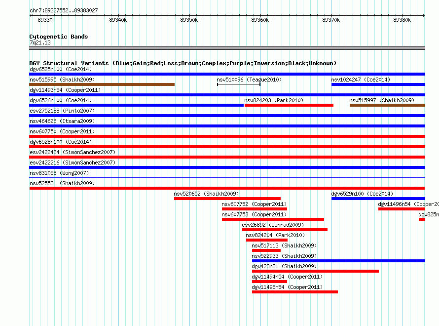 Variant DetailsVariant: nsv525531| Internal ID | 15452824 | | Landmark | | | Location Information | | | Cytoband | 7q21.13 | | Allele length | | Assembly | Allele length | | hg38 | 55476 | | hg19 | 55476 | | hg18 | 55476 | | hg17 | 55476 |