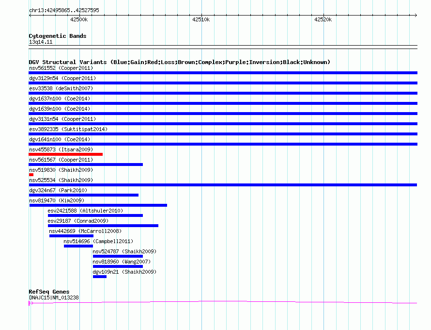 Variant DetailsVariant: nsv525534| Internal ID | 15106141 | | Landmark | | | Location Information | | | Cytoband | 13q14.11 | | Allele length | | Assembly | Allele length | | hg38 | 31731 | | hg19 | 31731 | | hg18 | 31731 | | hg17 | 31731 |