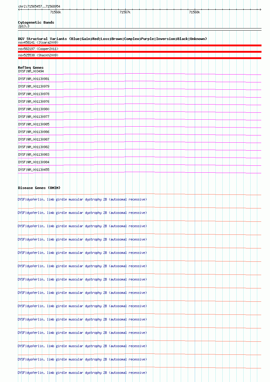 | Variant Type | CNV loss | Copy Number | | Allele State | | Allele Origin | | Probe Count | | Validation Flag | | Merged Status | M | Merged Variants | | Supporting Variants | nssv701674 | Samples | | Known Genes | DYSF | Method | SNP array | Analysis | Sample-level CNVs | Platform | GPL6434 | Comments | | Reference | Shaikh_et_al_2009 | Pubmed ID | 19592680 | Accession Number(s) | nsv525538