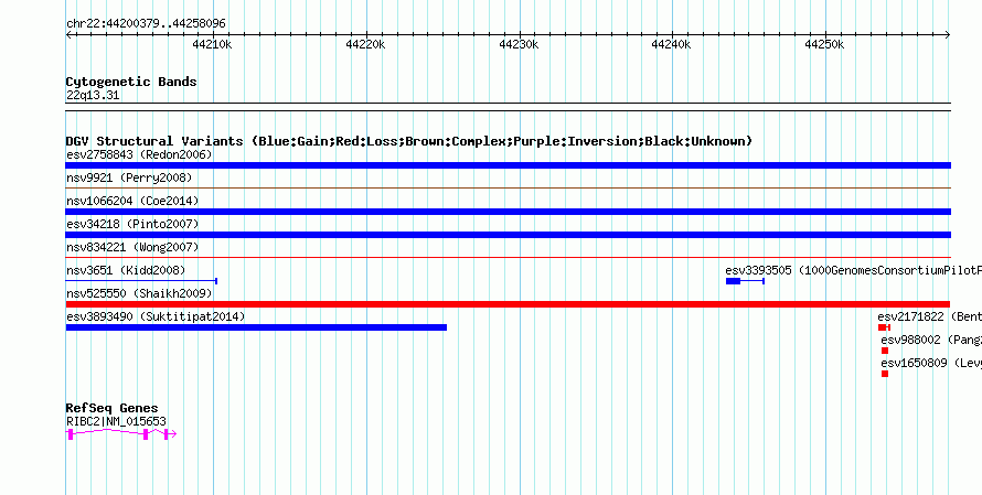 Variant DetailsVariant: nsv525550| Internal ID | 15452843 | | Landmark | | | Location Information | | | Cytoband | 22q13.31 | | Allele length | | Assembly | Allele length | | hg38 | 57717 | | hg19 | 57718 | | hg18 | 57718 | | hg17 | 57718 |