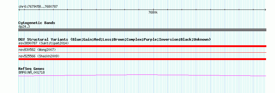 | Variant Type | CNV loss | Copy Number | | Allele State | | Allele Origin | | Probe Count | | Validation Flag | | Merged Status | M | Merged Variants | | Supporting Variants | nssv701705 | Samples | | Known Genes | BMP6 | Method | SNP array | Analysis | Sample-level CNVs | Platform | GPL6434 | Comments | | Reference | Shaikh_et_al_2009 | Pubmed ID | 19592680 | Accession Number(s) | nsv525566