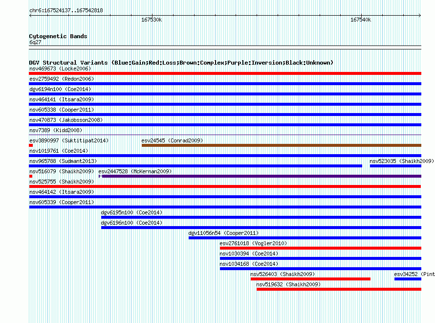 Variant DetailsVariant: nsv525755| Internal ID | 15453048 | | Landmark | | | Location Information | | | Cytoband | 6q27 | | Allele length | | Assembly | Allele length | | hg38 | 18682 | | hg19 | 18682 | | hg18 | 18682 | | hg17 | 18682 |