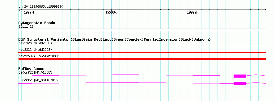 Variant DetailsVariant: nsv525824| Internal ID | 15106431 | | Landmark | | | Location Information | | | Cytoband | 20p11.23 | | Allele length | | Assembly | Allele length | | hg38 | 3026 | | hg19 | 3026 | | hg18 | 3026 | | hg17 | 3026 |