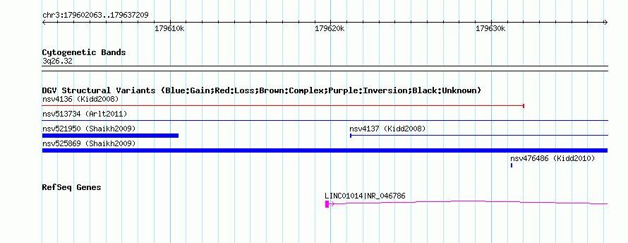 Variant DetailsVariant: nsv525869| Internal ID | 15453162 | | Landmark | | | Location Information | | | Cytoband | 3q26.32 | | Allele length | | Assembly | Allele length | | hg38 | 35147 | | hg19 | 35147 | | hg18 | 35147 | | hg17 | 35147 |
