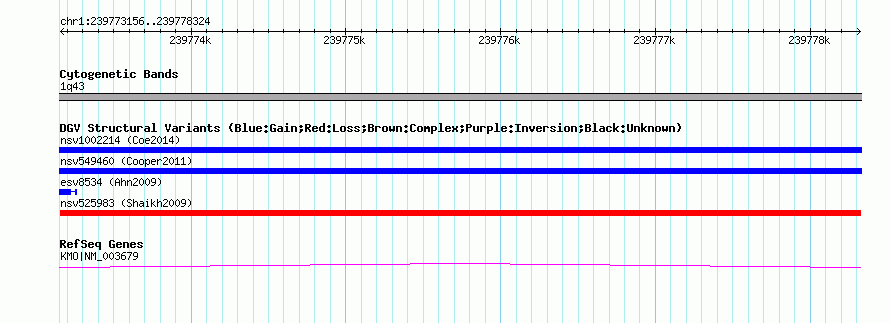 Variant DetailsVariant: nsv525983| Internal ID | 15453276 | | Landmark | | | Location Information | | | Cytoband | 1q43 | | Allele length | | Assembly | Allele length | | hg38 | 5169 | | hg19 | 5169 | | hg18 | 5169 | | hg17 | 5169 |