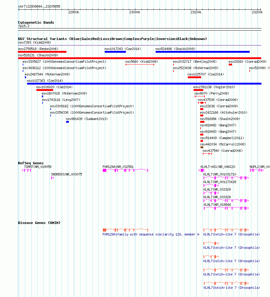| Variant Type | CNV loss | Copy Number | | Allele State | | Allele Origin | | Probe Count | | Validation Flag | | Merged Status | M | Merged Variants | | Supporting Variants | nssv702385 | Samples | | Known Genes | FAM126A, KLHL7, KLHL7-AS1, NUPL2, SNORD93, TOMM7 | Method | SNP array | Analysis | Sample-level CNVs | Platform | GPL6434 | Comments | | Reference | Shaikh_et_al_2009 | Pubmed ID | 19592680 | Accession Number(s) | nsv526131