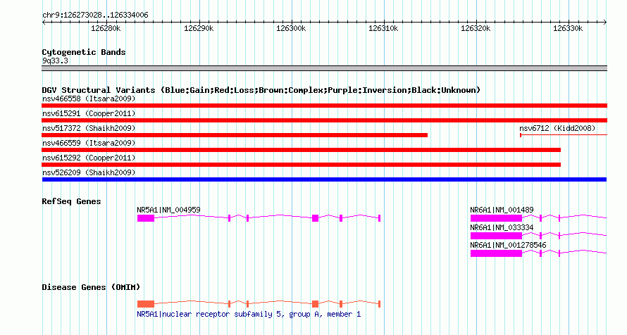 | | Variant Type | CNV gain | | Copy Number | | | Allele State | | | Allele Origin | | | Probe Count | | | Validation Flag | | | Merged Status | M | | Merged Variants | | | Supporting Variants | nssv702473 | | Samples | | | Known Genes | NR5A1, NR6A1 | | Method | SNP array | | Analysis | Sample-level CNVs | | Platform | GPL6434 | | Comments | | | Reference | Shaikh_et_al_2009 | | Pubmed ID | 19592680 | | Accession Number(s) | nsv526209