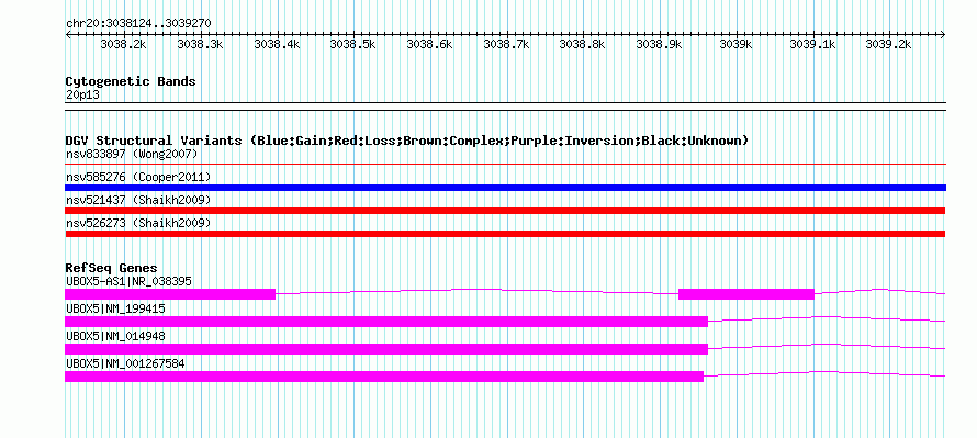 | Variant Type | CNV loss | Copy Number | | Allele State | | Allele Origin | | Probe Count | | Validation Flag | | Merged Status | M | Merged Variants | | Supporting Variants | nssv702548 | Samples | | Known Genes | UBOX5, UBOX5-AS1 | Method | SNP array | Analysis | Sample-level CNVs | Platform | GPL6434 | Comments | | Reference | Shaikh_et_al_2009 | Pubmed ID | 19592680 | Accession Number(s) | nsv526273