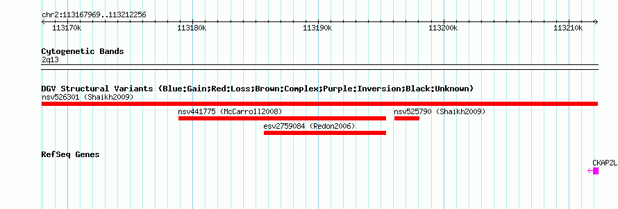 Variant DetailsVariant: nsv526301| Internal ID | 15106908 | | Landmark | | | Location Information | | | Cytoband | 2q13 | | Allele length | | Assembly | Allele length | | hg38 | 44288 | | hg19 | 44288 | | hg18 | 44288 | | hg17 | 44288 |