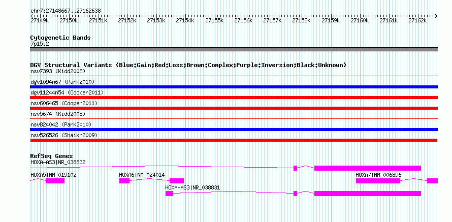 | | Variant Type | CNV loss | | Copy Number | | | Allele State | | | Allele Origin | | | Probe Count | | | Validation Flag | | | Merged Status | M | | Merged Variants | | | Supporting Variants | nssv702838 | | Samples | | | Known Genes | HOXA5, HOXA6, HOXA7, HOXA-AS3 | | Method | SNP array | | Analysis | Sample-level CNVs | | Platform | GPL6434 | | Comments | | | Reference | Shaikh_et_al_2009 | | Pubmed ID | 19592680 | | Accession Number(s) | nsv526526