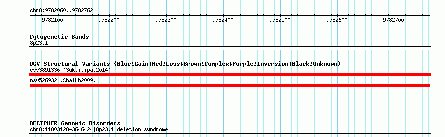 Variant DetailsVariant: nsv526932| Internal ID | 15454225 | | Landmark | | | Location Information | | | Cytoband | 8p23.1 | | Allele length | | Assembly | Allele length | | hg38 | 703 | | hg19 | 703 | | hg18 | 703 | | hg17 | 703 |