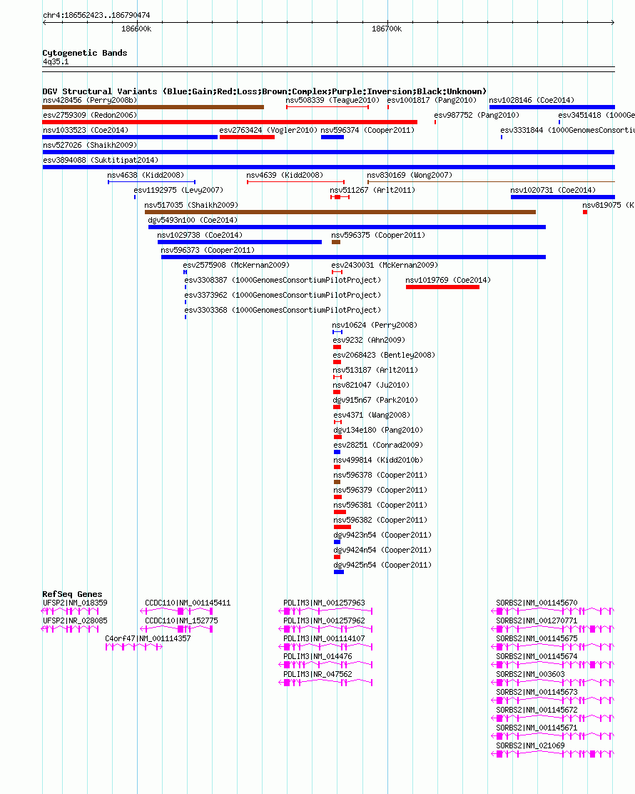 | Variant Type | CNV gain | Copy Number | | Allele State | | Allele Origin | | Probe Count | | Validation Flag | | Merged Status | M | Merged Variants | | Supporting Variants | nssv703401 | Samples | | Known Genes | C4orf47, CCDC110, PDLIM3, SORBS2, UFSP2 | Method | SNP array | Analysis | Sample-level CNVs | Platform | GPL6434 | Comments | | Reference | Shaikh_et_al_2009 | Pubmed ID | 19592680 | Accession Number(s) | nsv527026