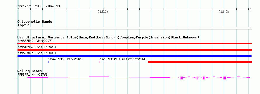 Variant DetailsVariant: nsv527075| Internal ID | 15454368 | | Landmark | | | Location Information | | | Cytoband | 17q25.1 | | Allele length | | Assembly | Allele length | | hg38 | 19296 | | hg19 | 19296 | | hg18 | 19296 | | hg17 | 19296 |