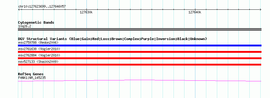Variant DetailsVariant: nsv527133| Internal ID | 15454426 | | Landmark | | | Location Information | | | Cytoband | 10q26.2 | | Allele length | | Assembly | Allele length | | hg38 | 22359 | | hg19 | 22359 | | hg18 | 22359 | | hg17 | 22359 |