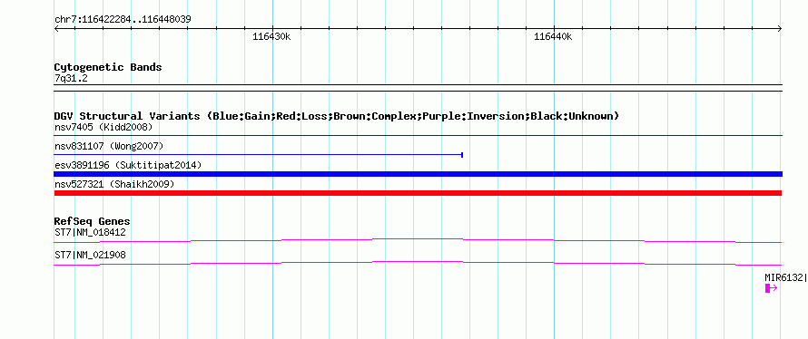 Variant DetailsVariant: nsv527321| Internal ID | 15454614 | | Landmark | | | Location Information | | | Cytoband | 7q31.2 | | Allele length | | Assembly | Allele length | | hg38 | 25756 | | hg19 | 25756 | | hg18 | 25756 | | hg17 | 25756 |