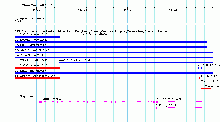 Variant DetailsVariant: nsv527464| Internal ID | 15454757 | | Landmark | | | Location Information | | | Cytoband | 1q44 | | Allele length | | Assembly | Allele length | | hg38 | 43505 | | hg19 | 43505 | | hg18 | 43505 | | hg17 | 43505 |
