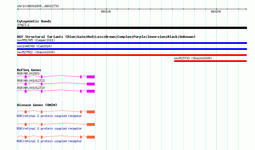 Variant DetailsVariant: nsv527522| Internal ID | 15454815 | | Landmark | | | Location Information | | | Cytoband | 10q23.1 | | Allele length | | Assembly | Allele length | | hg38 | 20825 | | hg19 | 20825 | | hg18 | 20825 | | hg17 | 20825 |