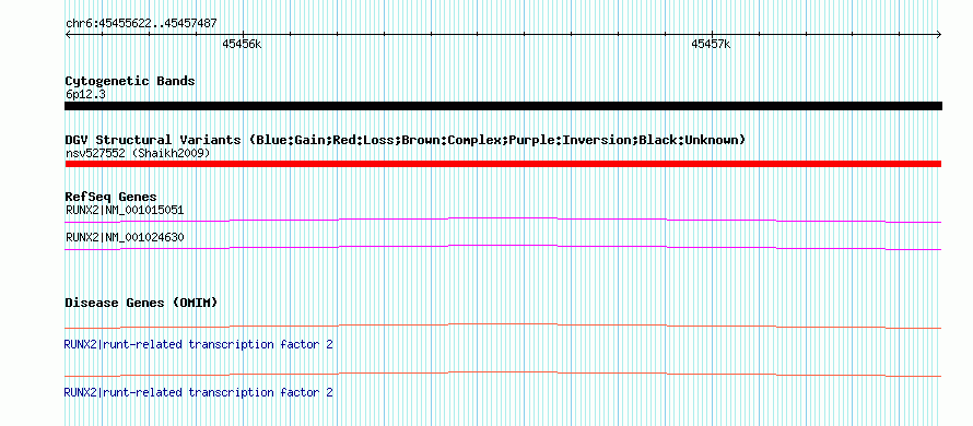 | | Variant Type | CNV loss | | Copy Number | | | Allele State | | | Allele Origin | | | Probe Count | | | Validation Flag | | | Merged Status | M | | Merged Variants | | | Supporting Variants | nssv704013 | | Samples | | | Known Genes | RUNX2 | | Method | SNP array | | Analysis | Sample-level CNVs | | Platform | GPL6434 | | Comments | | | Reference | Shaikh_et_al_2009 | | Pubmed ID | 19592680 | | Accession Number(s) | nsv527552
