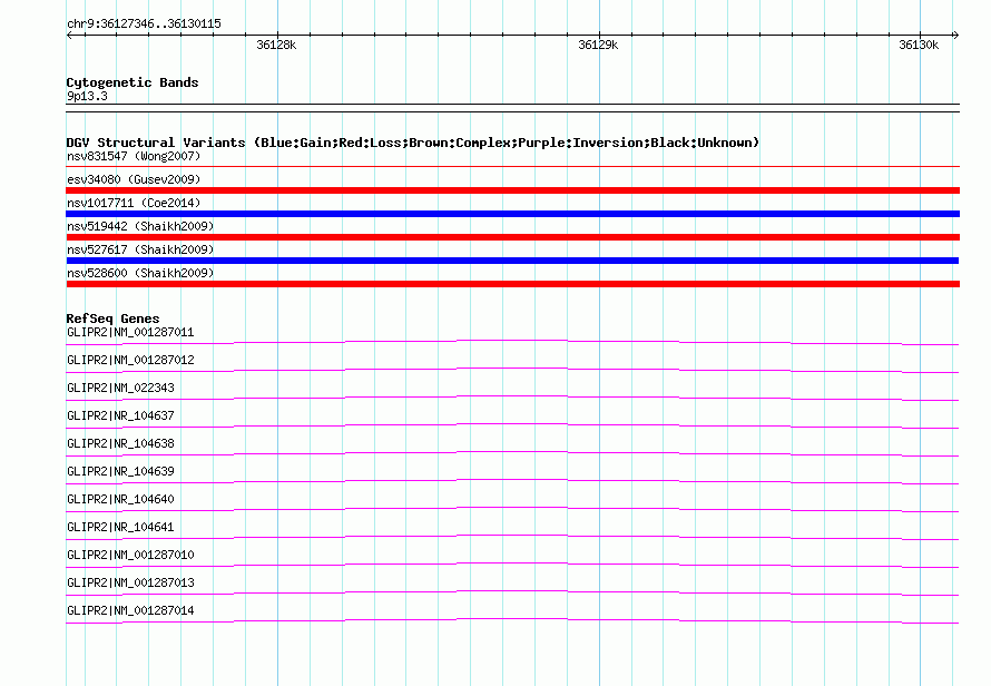 Variant DetailsVariant: nsv527617| Internal ID | 15454910 | | Landmark | | | Location Information | | | Cytoband | 9p13.3 | | Allele length | | Assembly | Allele length | | hg38 | 2770 | | hg19 | 2770 | | hg18 | 2770 | | hg17 | 2770 |