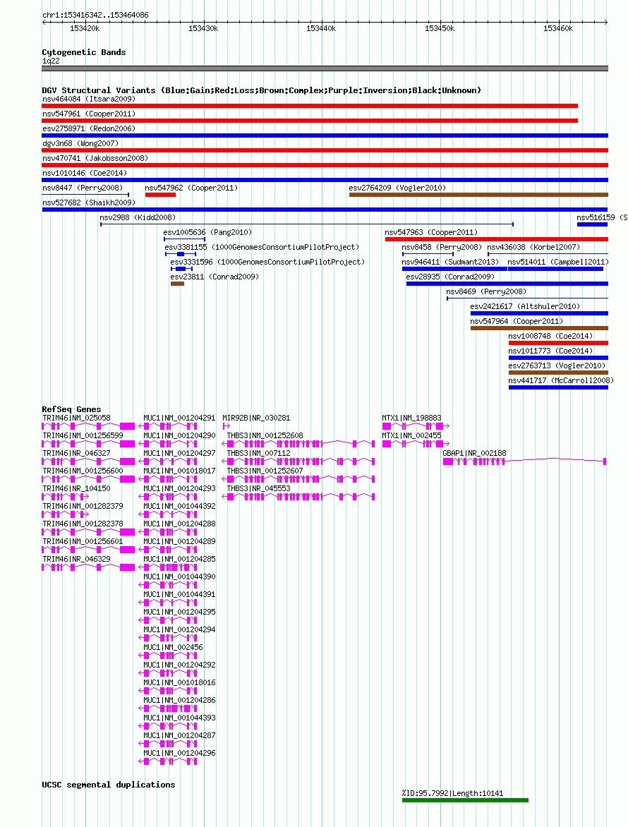 Variant DetailsVariant: nsv527682| Internal ID | 15108289 | | Landmark | | | Location Information | | | Cytoband | 1q22 | | Allele length | | Assembly | Allele length | | hg38 | 50430 | | hg19 | 47745 | | hg18 | 47745 | | hg17 | 47745 |