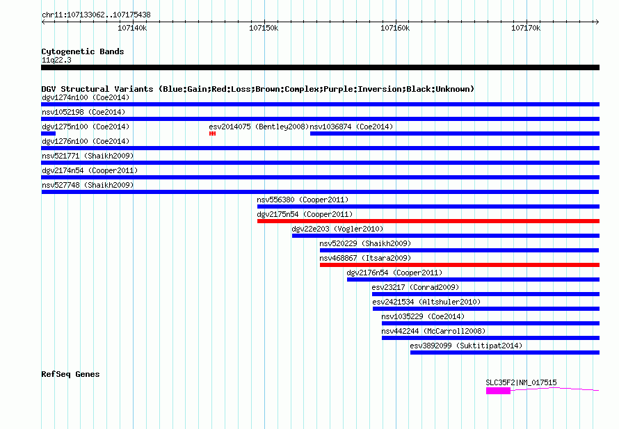 Variant DetailsVariant: nsv527748| Internal ID | 15455041 | | Landmark | | | Location Information | | | Cytoband | 11q22.3 | | Allele length | | Assembly | Allele length | | hg38 | 42377 | | hg19 | 42377 | | hg18 | 42377 | | hg17 | 42377 |