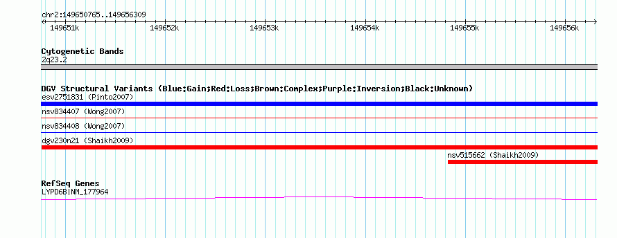 Variant DetailsVariant: nsv527796| Internal ID | 15455089 | | Landmark | | | Location Information | | | Cytoband | 2q23.2 | | Allele length | | Assembly | Allele length | | hg38 | 5545 | | hg19 | 5545 | | hg18 | 5545 | | hg17 | 5545 |