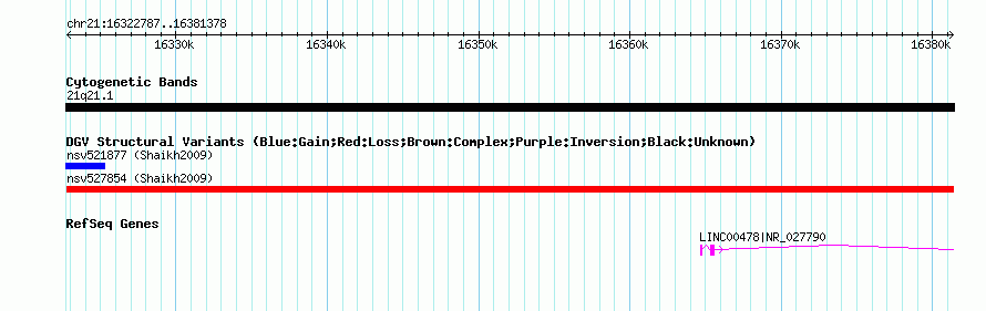Variant DetailsVariant: nsv527854| Internal ID | 15455147 | | Landmark | | | Location Information | | | Cytoband | 21q21.1 | | Allele length | | Assembly | Allele length | | hg38 | 58592 | | hg19 | 58592 | | hg18 | 58592 | | hg17 | 58592 |