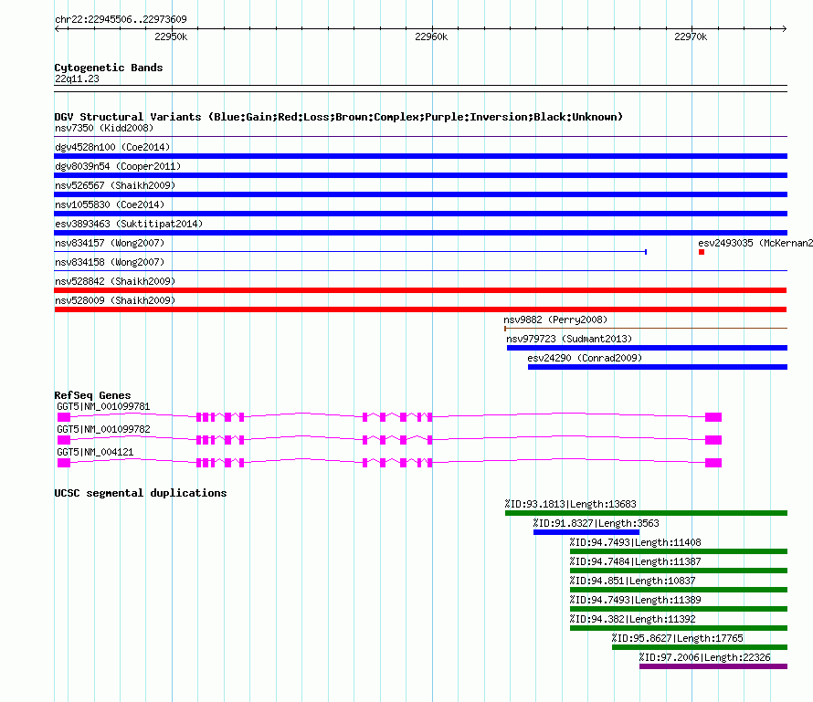 Variant DetailsVariant: nsv528009| Internal ID | 15108616 | | Landmark | | | Location Information | | | Cytoband | 22q11.23 | | Allele length | | Assembly | Allele length | | hg38 | 28104 | | hg19 | 28104 | | hg18 | 28104 | | hg17 | 28104 |
