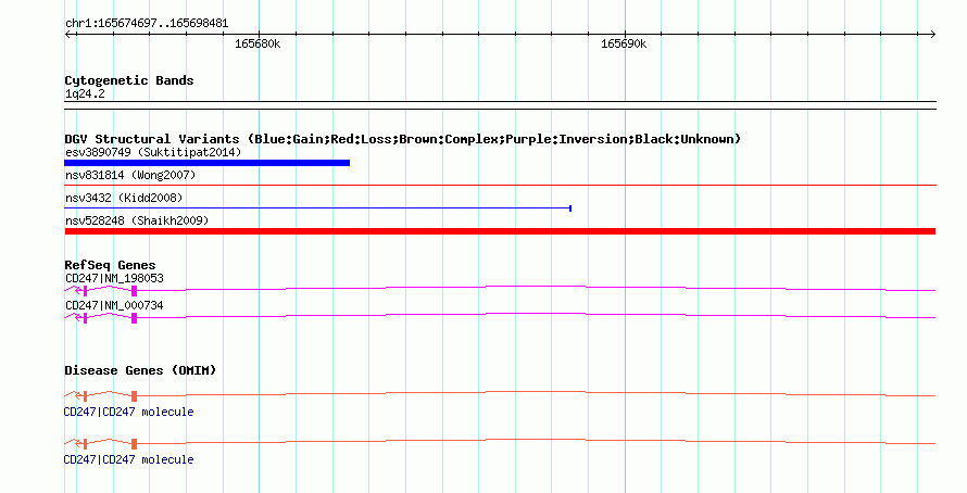 | Variant Type | CNV loss | Copy Number | | Allele State | | Allele Origin | | Probe Count | | Validation Flag | | Merged Status | M | Merged Variants | | Supporting Variants | nssv704814 | Samples | | Known Genes | CD247 | Method | SNP array | Analysis | Sample-level CNVs | Platform | GPL6434 | Comments | | Reference | Shaikh_et_al_2009 | Pubmed ID | 19592680 | Accession Number(s) | nsv528248