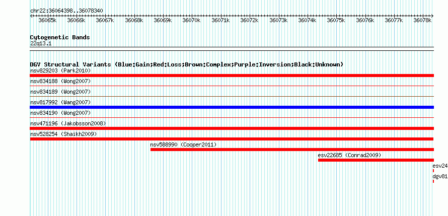 Variant DetailsVariant: nsv528254| Internal ID | 15455547 | | Landmark | | | Location Information | | | Cytoband | 22q13.1 | | Allele length | | Assembly | Allele length | | hg38 | 13944 | | hg19 | 13943 | | hg18 | 13943 | | hg17 | 13943 |