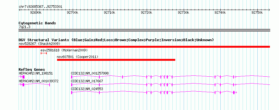 Variant DetailsVariant: nsv528267| Internal ID | 15455560 | | Landmark | | | Location Information | | | Cytoband | 7q21.3 | | Allele length | | Assembly | Allele length | | hg38 | 67936 | | hg19 | 67935 | | hg18 | 67935 | | hg17 | 67935 |
