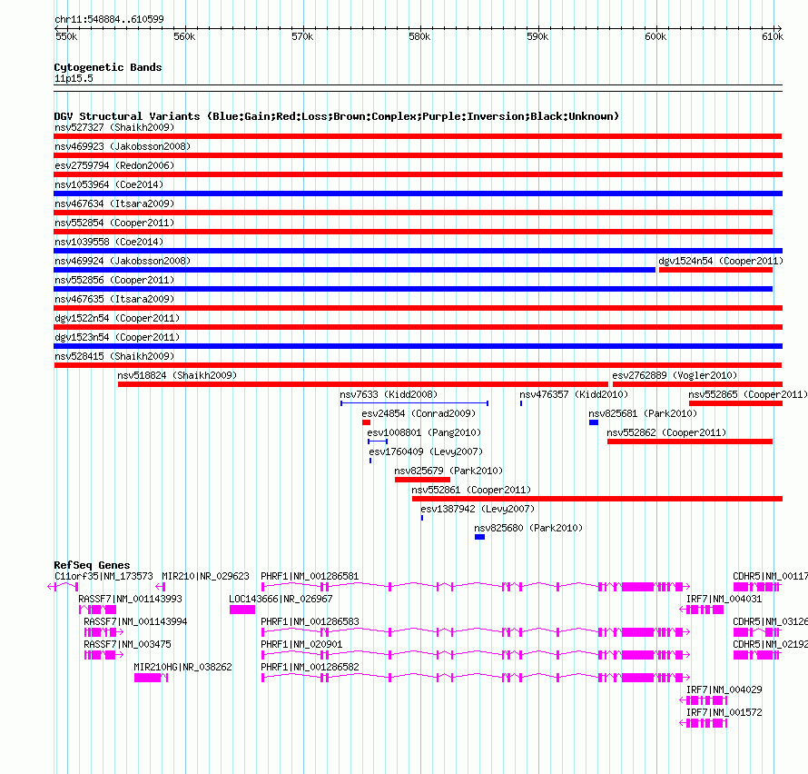 | Variant Type | CNV loss | Copy Number | | Allele State | | Allele Origin | | Probe Count | | Validation Flag | | Merged Status | M | Merged Variants | | Supporting Variants | nssv705007 | Samples | | Known Genes | C11orf35, CDHR5, IRF7, LOC143666, MIR210, MIR210HG, PHRF1, RASSF7 | Method | SNP array | Analysis | Sample-level CNVs | Platform | GPL6434 | Comments | | Reference | Shaikh_et_al_2009 | Pubmed ID | 19592680 | Accession Number(s) | nsv528415