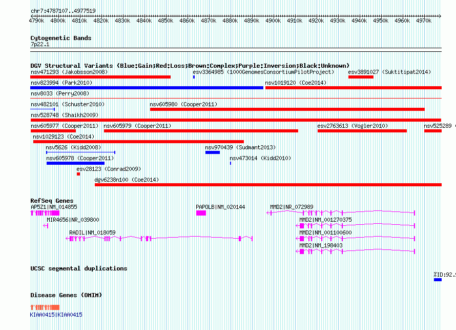 | Variant Type | CNV loss | Copy Number | | Allele State | | Allele Origin | | Probe Count | | Validation Flag | | Merged Status | M | Merged Variants | | Supporting Variants | nssv705409 | Samples | | Known Genes | AP5Z1, MIR4656, MMD2, PAPOLB, RADIL | Method | SNP array | Analysis | Sample-level CNVs | Platform | GPL6434 | Comments | | Reference | Shaikh_et_al_2009 | Pubmed ID | 19592680 | Accession Number(s) | nsv528748