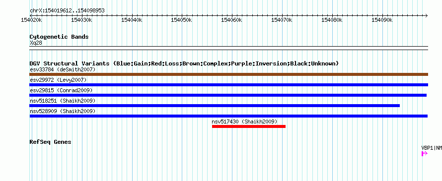 Variant DetailsVariant: nsv528909| Internal ID | 15456202 | | Landmark | | | Location Information | | | Cytoband | Xq28 | | Allele length | | Assembly | Allele length | | hg38 | 79340 | | hg19 | 79342 | | hg18 | 79342 | | hg17 | 79342 |