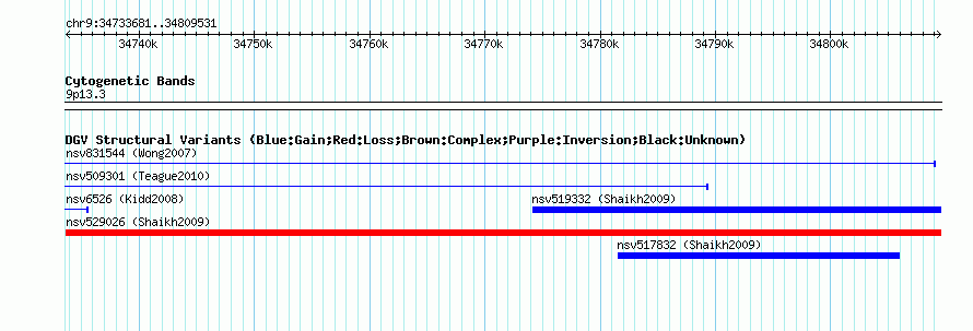 Variant DetailsVariant: nsv529026| Internal ID | 15456319 | | Landmark | | | Location Information | | | Cytoband | 9p13.3 | | Allele length | | Assembly | Allele length | | hg38 | 75851 | | hg19 | 75851 | | hg18 | 75851 | | hg17 | 75851 |