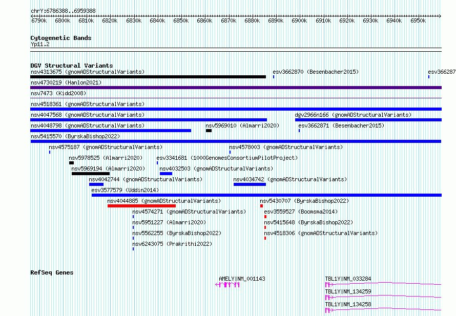 | | Variant Type | CNV duplication | | Copy Number | | | Allele State | | | Allele Origin | | | Probe Count | | | Validation Flag | | | Merged Status | M | | Merged Variants | | | Supporting Variants | nssv17738307 | | Samples | | | Known Genes | AMELY, TBL1Y | | Method | Sequencing | | Analysis | | | Platform | | | Comments | | | Reference | Byrska_Bishop_et_al_2022 | | Pubmed ID | 36055201 | | Accession Number(s) | nsv5415570