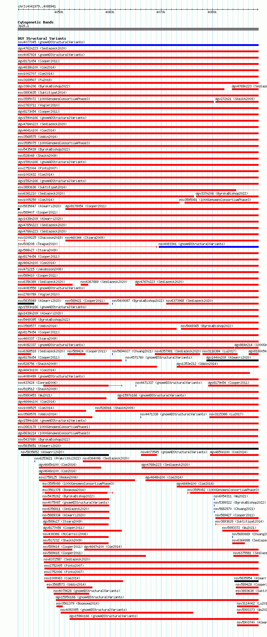 Variant DetailsVariant: nsv5437680| Internal ID | 216265 | | Landmark | | | Location Information | | | Cytoband | 3p26.1 | | Allele length | | Assembly | Allele length | | hg38 | 46963 | | hg19 | 46963 |