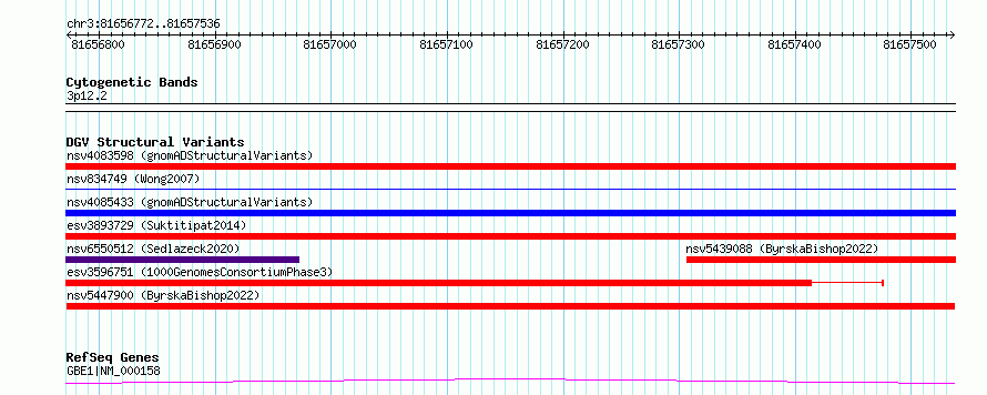 Variant DetailsVariant: nsv5447900| Internal ID | 226190 | | Landmark | | | Location Information | | | Cytoband | 3p12.2 | | Allele length | | Assembly | Allele length | | hg38 | 765 | | hg19 | 765 |