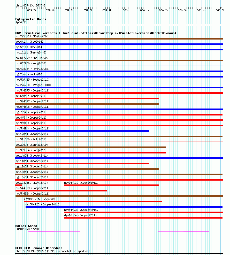| Variant Type | CNV gain+loss | Copy Number | | Allele State | | Allele Origin | | Probe Count | | Validation Flag | | Merged Status | M | Merged Variants | dgv13n54 | Supporting Variants | nssv708364, nssv708354, nssv708348, nssv708357, nssv708353, nssv708351, nssv708361, nssv708365, nssv708355, nssv708359, nssv708367, nssv708362, nssv708347, nssv708349, nssv708350, nssv708356, nssv708360, nssv708363, nssv708352, nssv708366, nssv708358 | Samples | | Known Genes | SAMD11 | Method | SNP array | Analysis | Illumina SNP array copy number analysis | Platform | Not reported | Comments | | Reference | Cooper_et_al_2011 | Pubmed ID | 21841781 | Accession Number(s) | nsv544923