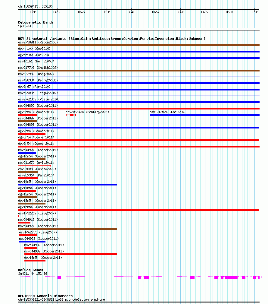 | Variant Type | CNV loss | Copy Number | | Allele State | | Allele Origin | | Probe Count | | Validation Flag | | Merged Status | M | Merged Variants | dgv15n54 | Supporting Variants | nssv708383, nssv708378, nssv708386, nssv708379, nssv708374, nssv708376, nssv708385, nssv708380, nssv708377, nssv708382, nssv708384, nssv708381, nssv708375 | Samples | | Known Genes | SAMD11 | Method | SNP array | Analysis | Illumina SNP array copy number analysis | Platform | Not reported | Comments | | Reference | Cooper_et_al_2011 | Pubmed ID | 21841781 | Accession Number(s) | nsv544925