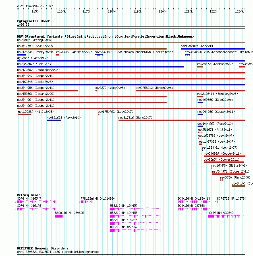 | Variant Type | CNV loss | Copy Number | | Allele State | | Allele Origin | | Probe Count | | Validation Flag | | Merged Status | M | Merged Variants | | Supporting Variants | nssv708526 | Samples | | Known Genes | ACAP3, B3GALT6, FAM132A, MIR6726, SCNN1D, SDF4, UBE2J2 | Method | SNP array | Analysis | Illumina SNP array copy number analysis | Platform | Not reported | Comments | | Reference | Cooper_et_al_2011 | Pubmed ID | 21841781 | Accession Number(s) | nsv544965