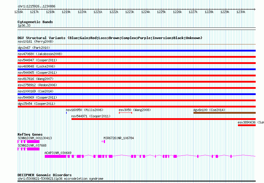 Variant DetailsVariant: nsv544967| Internal ID | 16332376 | | Landmark | | | Location Information | | | Cytoband | 1p36.33 | | Allele length | | Assembly | Allele length | | hg38 | 14961 | | hg19 | 14961 | | hg18 | 14961 |