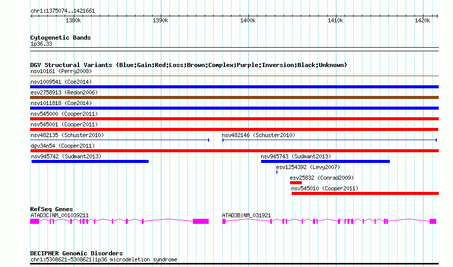 | | Variant Type | CNV loss | | Copy Number | | | Allele State | | | Allele Origin | | | Probe Count | | | Validation Flag | | | Merged Status | M | | Merged Variants | dgv34n54 | | Supporting Variants | nssv708586, nssv708587 | | Samples | | | Known Genes | ATAD3B, ATAD3C | | Method | SNP array | | Analysis | Illumina SNP array copy number analysis | | Platform | Not reported | | Comments | | | Reference | Cooper_et_al_2011 | | Pubmed ID | 21841781 | | Accession Number(s) | nsv545002