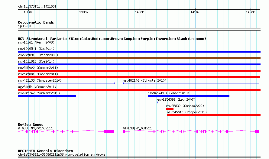 | | Variant Type | CNV loss | | Copy Number | | | Allele State | | | Allele Origin | | | Probe Count | | | Validation Flag | | | Merged Status | M | | Merged Variants | dgv34n54 | | Supporting Variants | nssv708592, nssv708593 | | Samples | | | Known Genes | ATAD3B, ATAD3C | | Method | SNP array | | Analysis | Illumina SNP array copy number analysis | | Platform | Not reported | | Comments | | | Reference | Cooper_et_al_2011 | | Pubmed ID | 21841781 | | Accession Number(s) | nsv545007