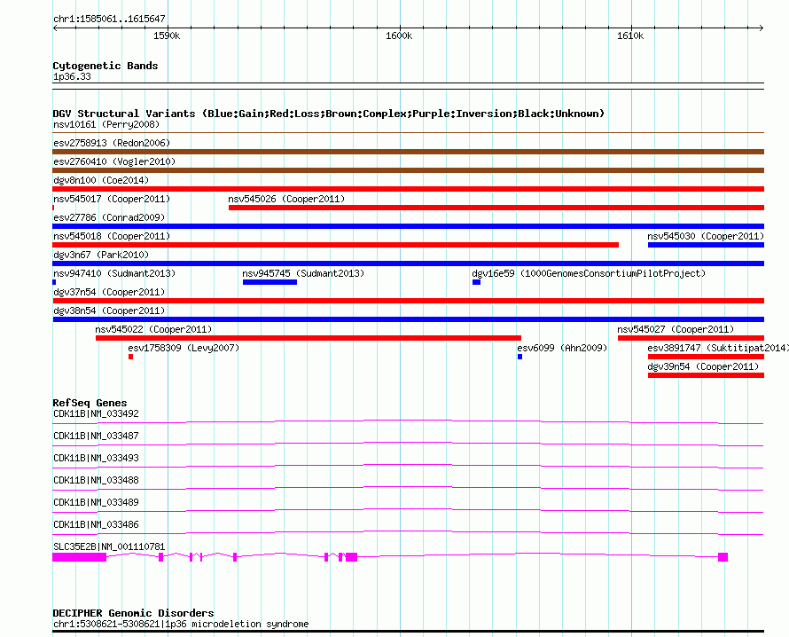 Variant DetailsVariant: nsv545019| Internal ID | 16332428 | | Landmark | | | Location Information | | | Cytoband | 1p36.33 | | Allele length | | Assembly | Allele length | | hg38 | 30590 | | hg19 | 30590 | | hg18 | 30587 |