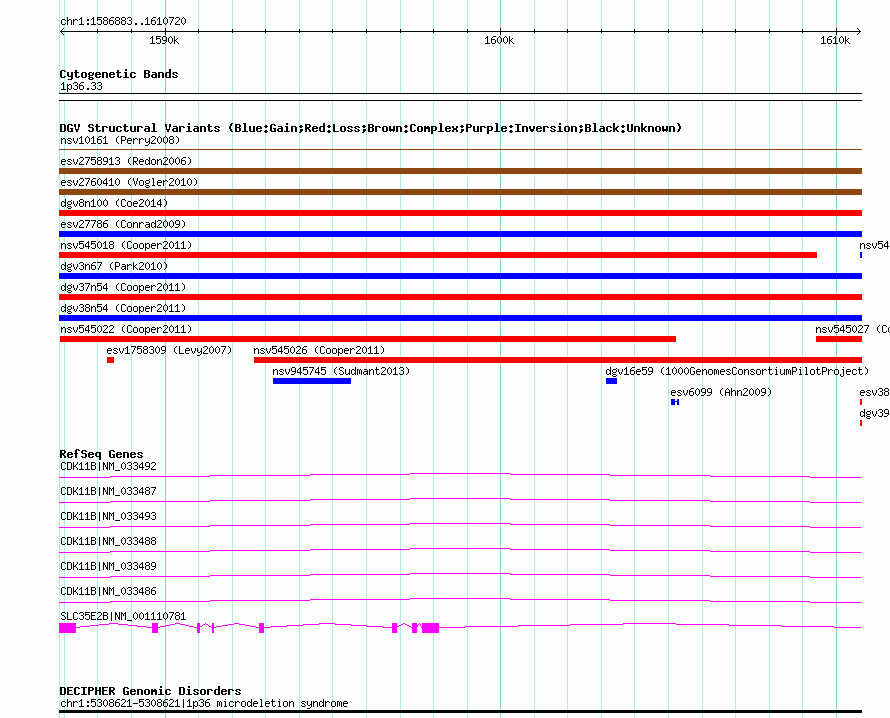 Variant DetailsVariant: nsv545023| Internal ID | 16332432 | | Landmark | | | Location Information | | | Cytoband | 1p36.33 | | Allele length | | Assembly | Allele length | | hg38 | 23840 | | hg19 | 23840 | | hg18 | 23838 |