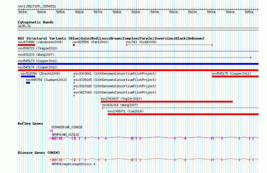 Variant DetailsVariant: nsv545174| Internal ID | 16332583 | | Landmark | | | Location Information | | | Cytoband | 1p36.31 | | Allele length | | Assembly | Allele length | | hg38 | 127227 | | hg19 | 127227 | | hg18 | 127227 |