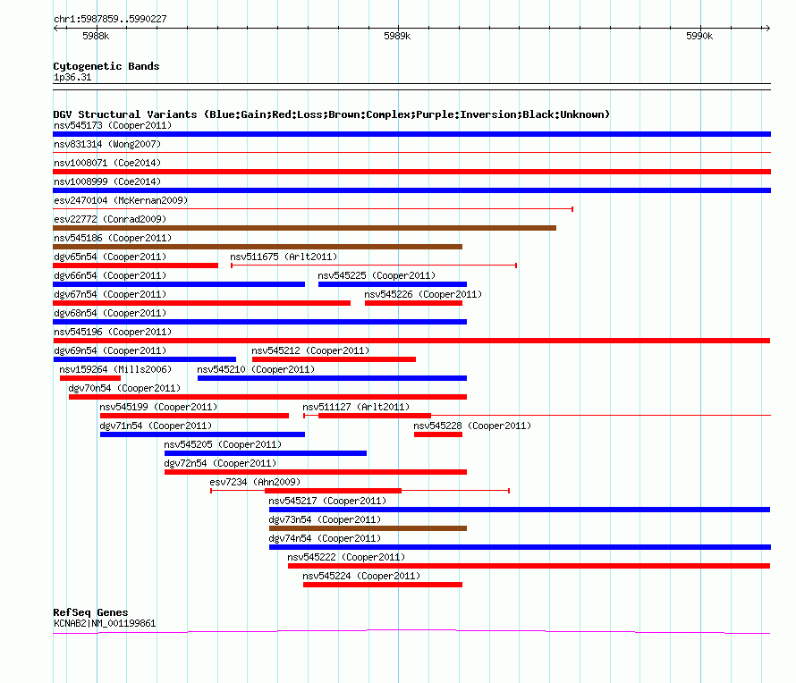 Variant DetailsVariant: nsv545196| Internal ID | 15985919 | | Landmark | | | Location Information | | | Cytoband | 1p36.31 | | Allele length | | Assembly | Allele length | | hg38 | 2369 | | hg19 | 2369 | | hg18 | 2369 |