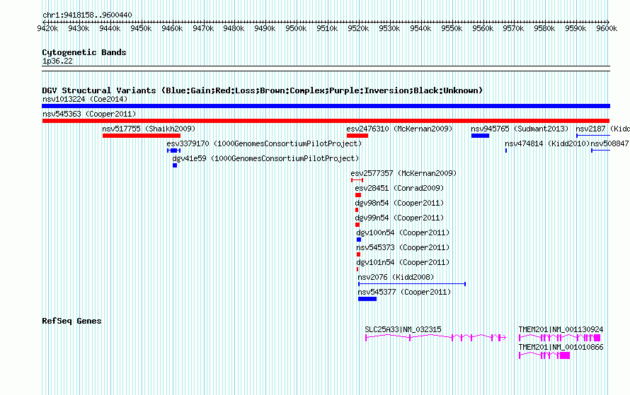 | Variant Type | CNV loss | Copy Number | | Allele State | | Allele Origin | | Probe Count | | Validation Flag | | Merged Status | M | Merged Variants | | Supporting Variants | nssv709671 | Samples | | Known Genes | SLC25A33, TMEM201 | Method | SNP array | Analysis | Illumina SNP array copy number analysis | Platform | Not reported | Comments | | Reference | Cooper_et_al_2011 | Pubmed ID | 21841781 | Accession Number(s) | nsv545363